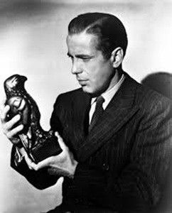 As to the character Bogart plays, that of private detective Sam Spade, the iconic gumshoe was the creation of Dashiell Hammett (1894-1961, photo at left). Based on Hammett’s time as a Pinkerton detective from people he knew or had heard about, Spade first appeared in the third of Hammett’s five novels, The Maltese Falcon, in 1930, after being serialized in Black Mask magazine from its September 1929 to January 1930 issues. Only three other stories, all short works, would feature Spade in magazines and all appeared in 1932. One final Spade story was published in 2013, over 50 years after his death in 1961. The Maltese Falcon was brought to film three times: 1931, 1936, and the now film noir classic of 1941 starring Humphrey Bogart as Sam Spade, Peter Lorre as Joel Cairo, criminal and partner of Kasper Gutman, Mary Astor as the deceitful femme fatale Brigid O’Shaughnessy, and Sydney Greenstreet as Kasper Gutman the “Fat Man,” the wealthy, ruthless crime lord who will stop at nothing to get his hands on the priceless bejeweled statuette, including betraying his lackey Joel Cairo.