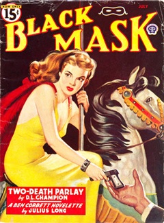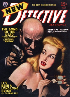 {Airing on a Wednesday evening at 10 PM. and with no school the next day it being the middle of summer vacation, the neighborhood gang could hardly wait for the nearby newsstand to open so they could begin leafing through some of their favorite detective magazines for more hardcore stories of the sort like “The Maltese Falcon” they had heard the night before. Black Mask (1920-1951) was the undisputed king of the detective pulps and the issue below was quickly relieved of its place on the long wall shelf next to the other detective and mystery pulps. It was in the process of switching from a monthly to a bi-monthly and saw 7 issues in 1946. New Detective (1941-1955) promoted itself by letting its readers know that it ran the newest in crime fiction by many of the most popular writers of the day, with an emphasis on police detectives. Like Black Mask, it was a bi-monthly in 1946, though it did manage, for some reason, to squeeze in a February issue between is January and March offerings. Super-Detective (1934-35, 1940-50) ran for only 15 issues in its first iteration, but came back in fine fashion in 1940 to publish another 65 issues, despite the fact that at least one source commented that it ran the usual gamut of detective fiction. Even though its schedule the second time around jumped back and forth between monthly and bi-monthly every six months or so for a few years, it must have been doing something right to have hung around for so long. It was a bi-monthly in 1946.}
