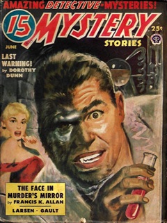 {“The Eyes of Buddha” aired on Sunday, July 2, 1950 and caught the interest and imagination of the neighborhood gang. They found themselves at the front door of the corner newsstand bright and early the next morning, waiting anxiously for the door to open so they could be the first to hunt down some of their favorite magazines, those where the bad guys always seemed to lose to the good guys, and whether the bad guys were domestic or foreign made no difference. Black Book Detective (1933-53) began as an average detective pulp until it introduced the Black Bat detective in its July 1939 issue. The Black Bat’s adventures appeared in 60% of the rest of the pulp’s issues, accounting almost entirely for its lengthy 20-year run. It was a quarterly in 1950. 15 Mystery Stories (1932-50) began under the title of Dime Mystery as a middle of the road detective pulp, but soon reformulated its focus to a magazine of “weird menace” at which time it began to flourish. It changed its long-running title of Dime Mystery to 15 Mystery Stories at the beginning of 1950, but the name change lasted only 5 issues as the magazine would fold with its October 1950 bimonthly issue. Thrilling Detective (1931-53) was one of the few early detective pulps to last into the 1950s, attesting to its popularity due to the overall consistent quality of its fiction. It held to a monthly schedule until 1946 when it became a bimonthly through mid-1952, finishing its final year and a half with an irregular schedule of part quarterly, part bimonthly issues.}