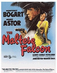 Sam Spade was the private detective and creation of Dashiell Hammett (1894-1961, photo at right). Based on Hammett’s time as a Pinkerton detective from people he knew or had heard about, Spade first appeared in the third of Hammett’s five novels, The Maltese Falcon, in 1930. Only three other stories, all short works, would feature Spade in magazines and all appeared in 1932. One final Spade story was published in 2013, over 50 years after his death in 1961. The Maltese Falcon was brought to film three times: 1931, 1936, and the now film noir classic of 1941 starring Humphrey Bogart, Mary Astor, Sydney Greenstreet, and Peter Lorre.
