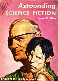{Airing on a late Sunday afternoon in early September of 1957, the neighborhood gang was still glued to their radios while some of their parents were glued to their favorite grownup shows on the family’s big new TVs. With summer vacation over and another school year about to begin, the gang could hardly wait to hit the nearby newsstand the next day after school. Astounding SF (1930-present, now Analog) was always a must buy, and with the issue below sporting a new Robert Heinlein novel in the offing it was as good as sold. ASF was a monthly in 1957. The Magazine of Fantasy & Science Fiction (1949-present, but with a hiatus after the summer 2024 issue) was now firmly established as a popular newcomer and had become another always awaited SF digest magazine and an obvious purchase. It, too, was a monthly in 1957. Galaxy SF (1950-1980) shook things up with its fresh approach to which themes and topics—political, social, and economic—SF authors could examine, and in short order it was the place to be, both for writers and readers. It was a monthly in 1957, and it and F&SF were giving Astounding a run for its money.}